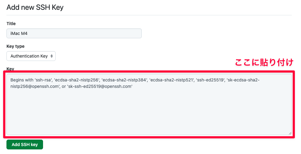 $ pbcopy < ~/.ssh/id_ed25519.pubpbcopyまで実行したらGitHubにログインし、SSHの設定を行います。